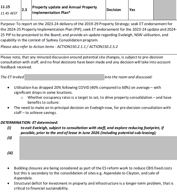 3. A full exit from Eveleigh during December 2025, relocating staff to an ABW environment at
