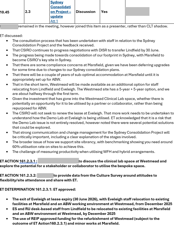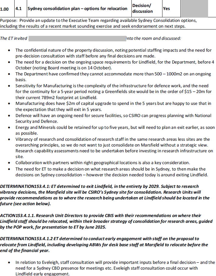 over the proposal to make Marsfield our key Sydney site, with the plan to exit Eveleigh by June 2025, and