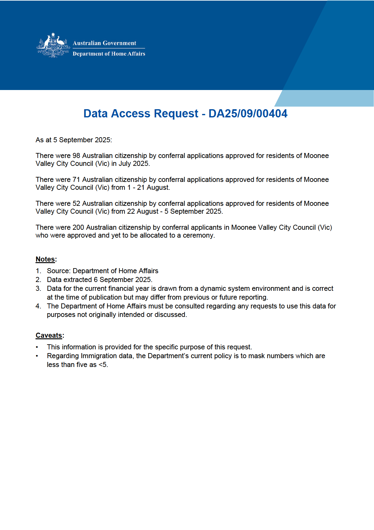 This is an HTML version of an attachment to the Freedom of Information request 'Citizenship Approvals and Ceremony Invitations for Moonee Valley Council'.