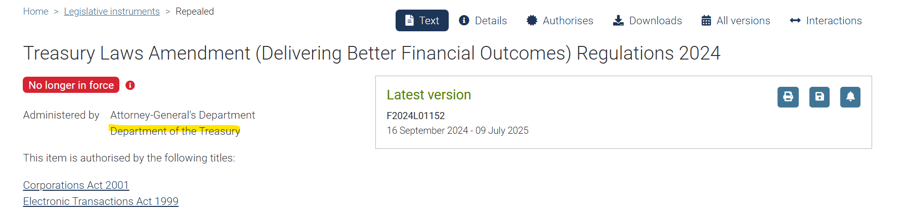 - Treasury Laws Amendment (Delivering Better Financial Outcomes) Regulations 2024